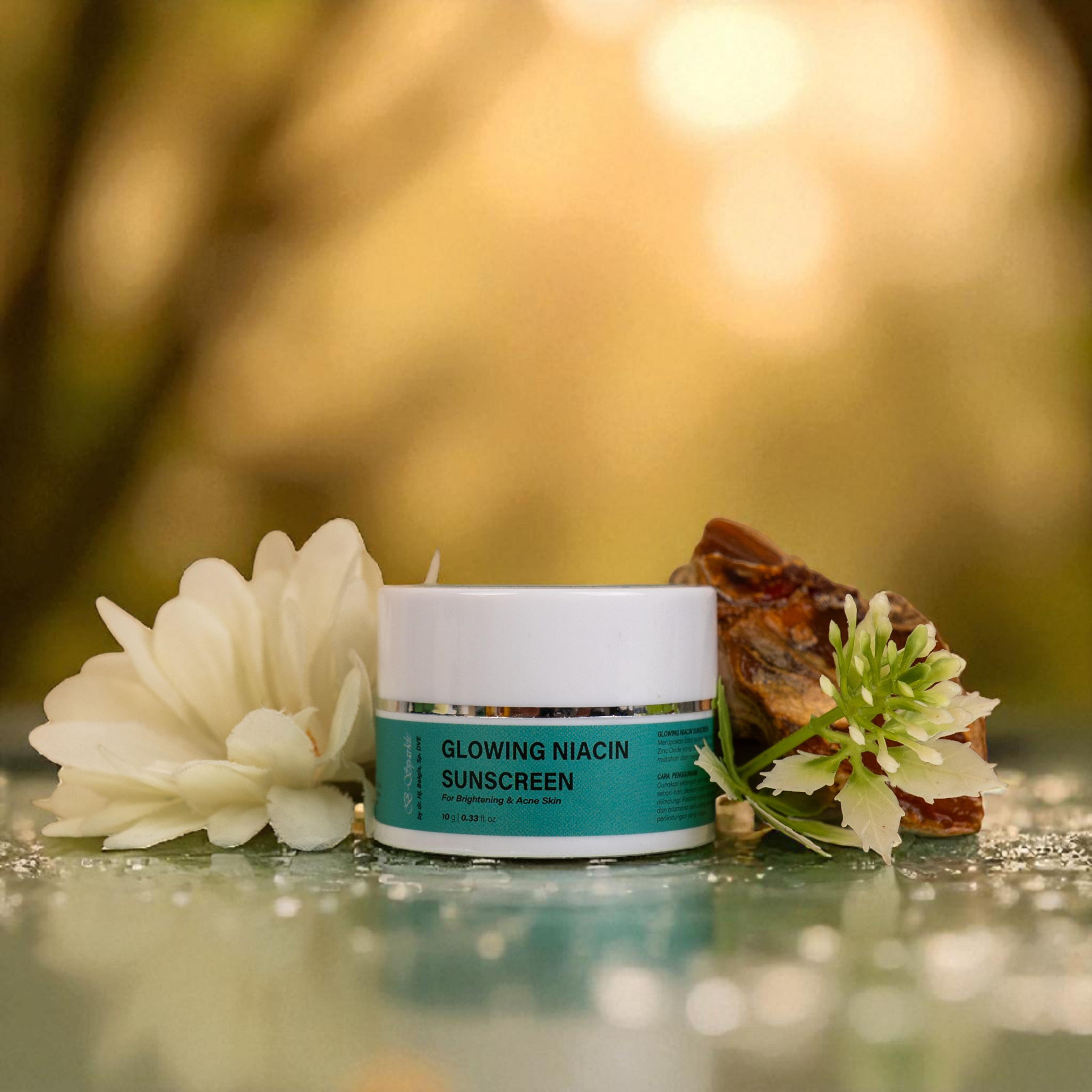 Glowing Niacin Sunscreen B-Sparkle dengan kandungan utama Niacinamide dan Zinc Oxide yang dapat melindungi kulit dari paparan sinar matahari, mencerahkan kulit, mengecilkan pori-pori, dan menyamarkan flek hitam. Dengan formula water base sehingga mudah meresap di kulit dan tidak lengket, sangat cocok untuk kulit oily atau cenderung berjerawat.